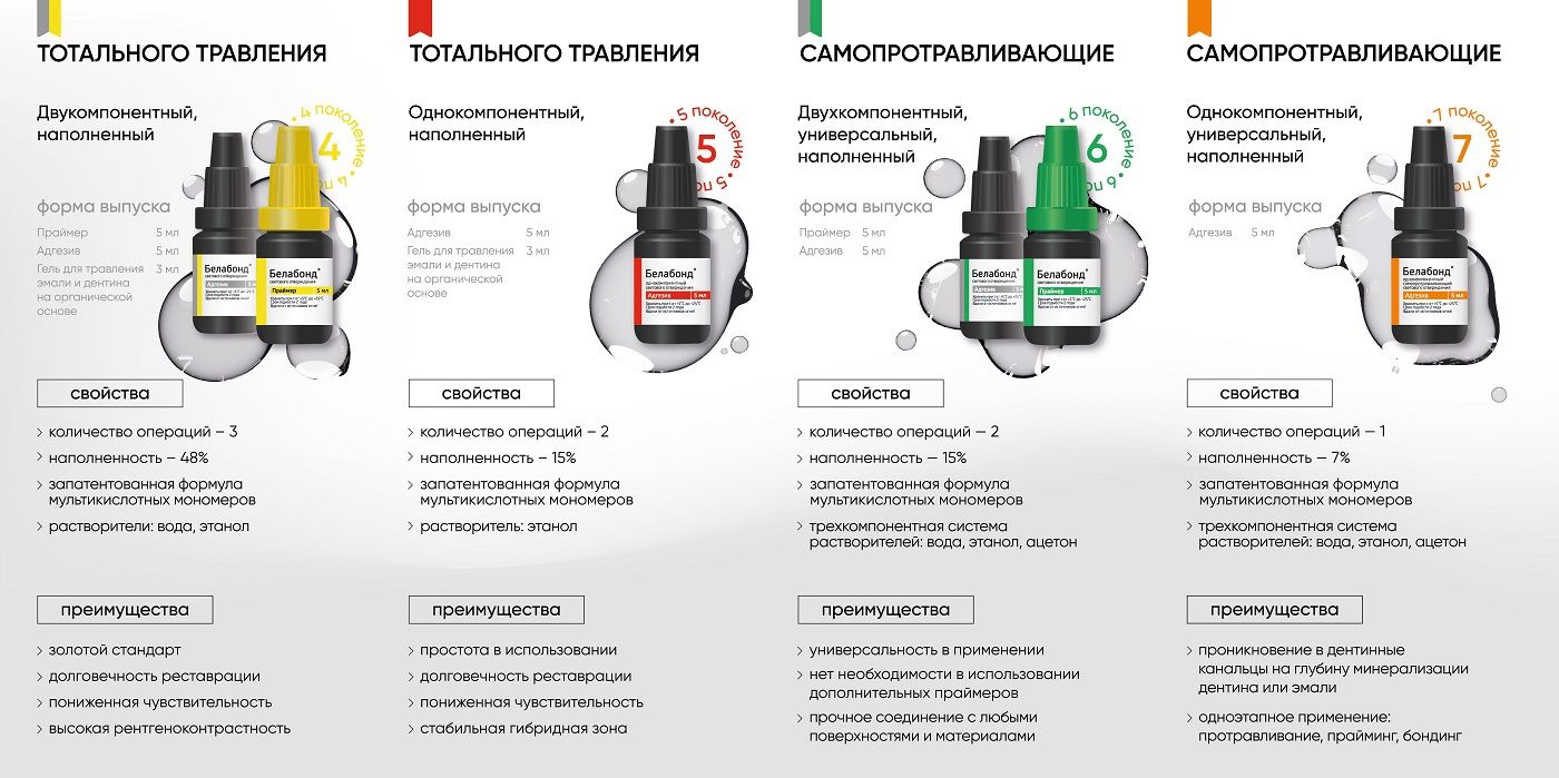 Адгезивная самопротравливающая система «Белабонд» имеет химическое сродство с композиционными материалами светового и двойного отверждения, тонким слоем растекается по обрабатываемой поверхности, образуя пленку ≈ 5 мкм и обеспечивая надежную связь тканей зуба с композитом. Перед отверждением адгезивная самопротравливающая система «Белабонд» имеет низкий водородный показатель (рН), что обеспечивает эффективное протравливание эмали. После отверждения рН становится нейтральным, что обеспечивает исключительную совместимость практически со всеми типами композитов, что исключает необходимость использования каких-либо вспомогательных материалов.