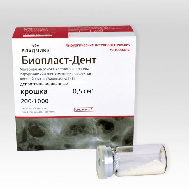 Материал «Биопласт-Дент» (депротеинизированный) обладает высокой биологической совместимостью, способствующей отсутствию иммунных реакций организма реципиента, а также сочетается со всеми видами трансплантатов, имплантатов, эндофиксаторов.