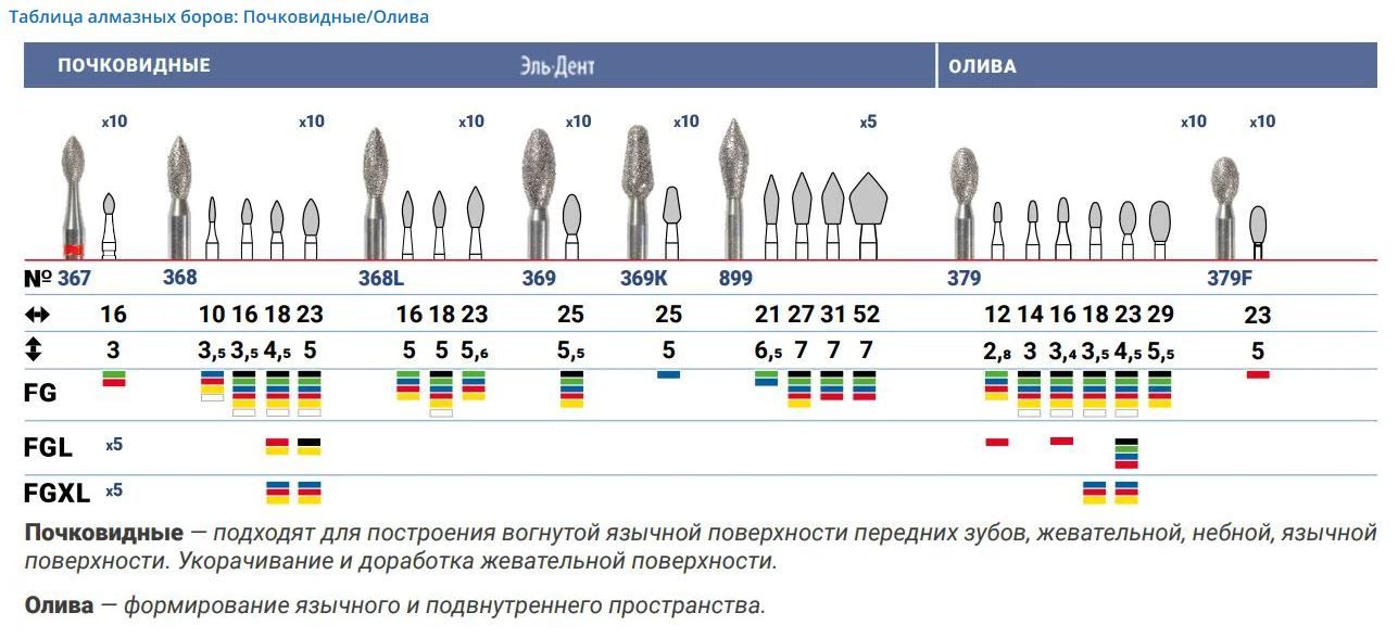Боры окодент Таблица алмазных боров: Почковидные/Олива