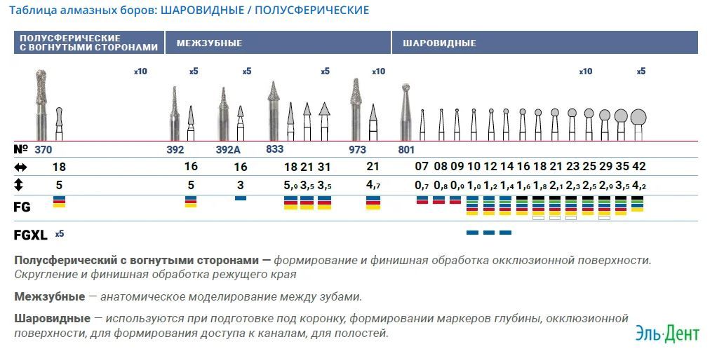 Таблица алмазных боров: ШАРОВИДНЫЕ / ПОЛУСФЕРИЧЕСКИЕ