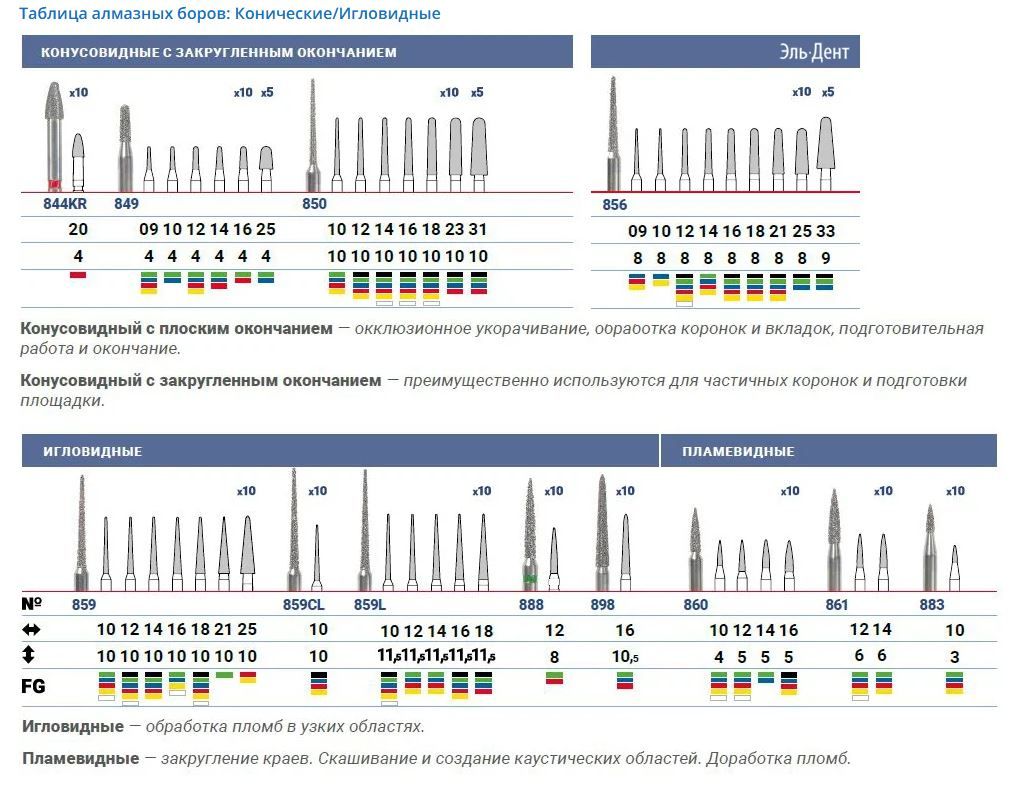 Таблица алмазных боров: Конические/Игловидные