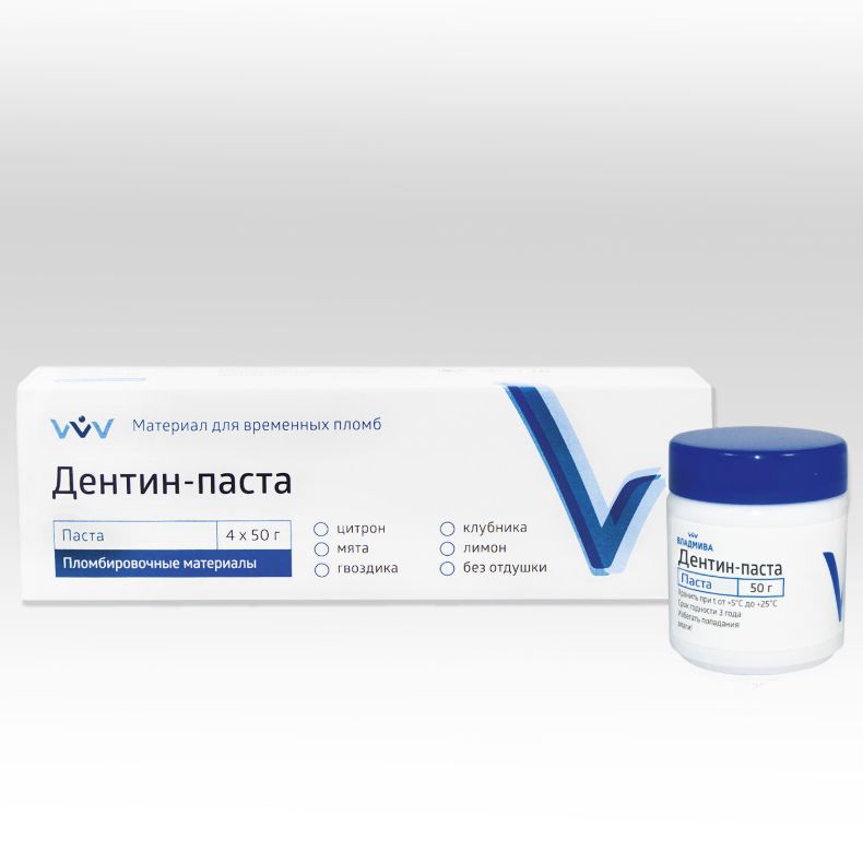Материал «Дентин-паста» является цинк-сульфатным цементом на полимерной основе и представляет собой готовую к применению однородную пасту, отверждающуюся под воздействием влаги полости рта. Материал "Дентин-паста" отверждается под воздействием влаги в течение 2-3-х часов, в процессе затвердевания материал расширяется, обеспечивая плотное краевое прилегание.