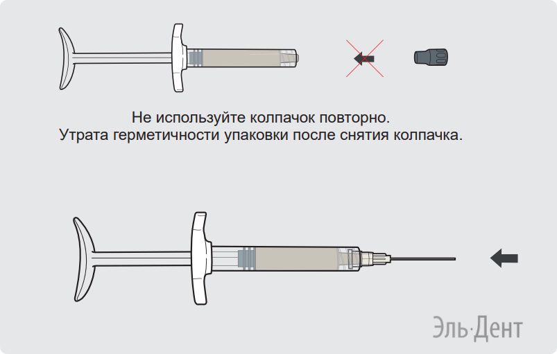 3) После применения отрезать металлический кончик канюли, сохранив остальную часть на месте до следующего применения. Перед следующим пломбированием заменить канюлю 24G на новую.