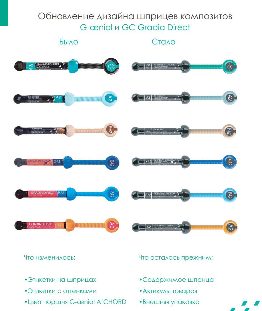 - GC G-anial Anterior удовлетворяет любые эстетические требования – 22 оттенка, 3 степени светопроницаемости: Эмалевые (Внешние/Outside); Дентинные (Стандартные/Standard); Дентинные опаковые (Внутренние/Inside);