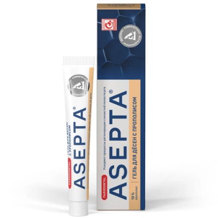 Средство на основе прополиса, применяемое при воспалительных процессах, микроповреждениях слизистой оболочки полости рта и повышенной чувствительности дёсен. Рекомендуется, в том числе при использовании съёмных протезов, брекет-систем. Гель для десен ASEPTA изготовлен на основе прополиса, который обладает противовоспалительным, противомикробным действием в отношении грамположительных бактерий, а также противозудным и анальгезирующим эффектами (снижает болезненность пораженных тканей), ускоряет процесс регенерации и эпителизации раневых поверхностей, стимулирует метаболические процессы.