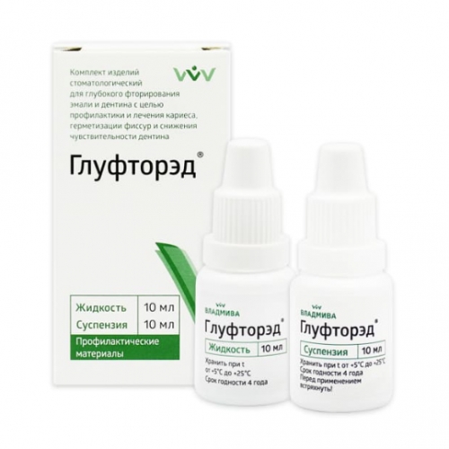 В стоматологический комплект «Глуфторэд» входят: жидкость – раствор голубого цвета, содержащий ионы фтора и меди, суспензия – мелкодисперсная гидроокись кальция в дистиллированной воде с добавлением стабилизатора.