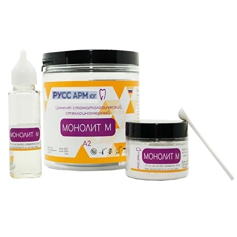 Описание: МОНОЛИТ М (А2) - цемент ортопедический стеклоиномерный (30г+15мл). Русс Арм Юг