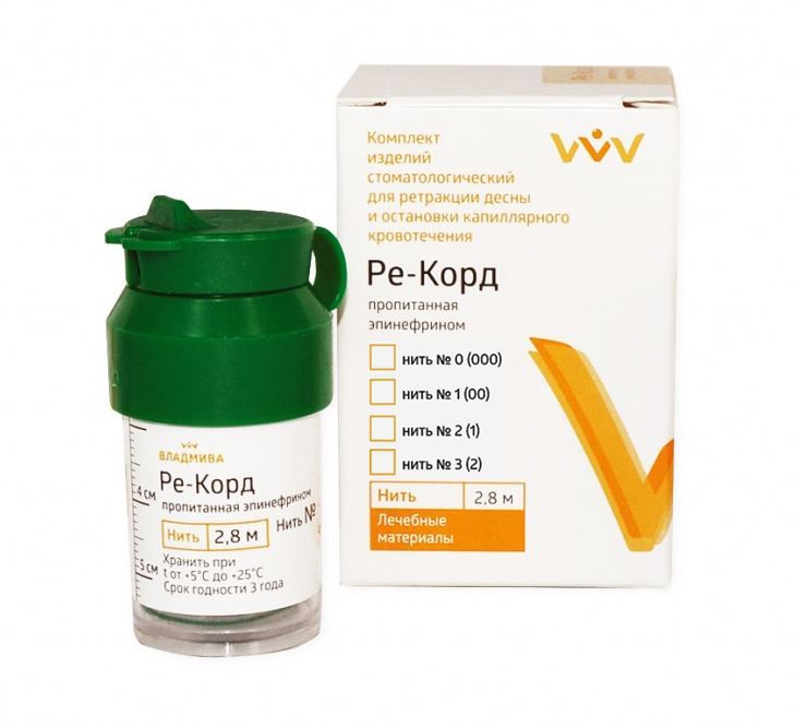 Пропитанные эпинефрином ретракционные нити «Ре-Корд» представляют собой готовую к применению форму: плетеные хлопковые нити, армированные полиэфирным волокном, обработанные по специальной технологии; применяются для комбинированной химико-механической ретракции десны, обеспечивают эффективную ретракцию, необходимую, в частности, для получения оттисков высокого качества