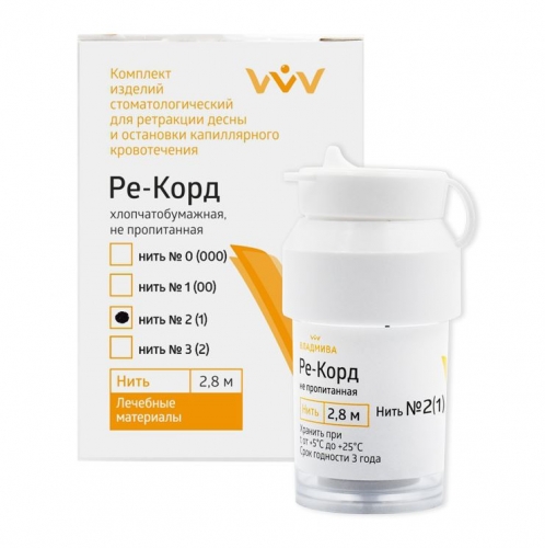 Ретракционные нити «Ре-Корд» изготавливают плетением из хлопчатобумажного волокна, обладающего уникальными абсорбирующими свойствами. Плетение нитей снижает вероятность их разволокнения и включения волокон в оттиски. Темный цвет нитей необходим для легкого обнаружения их в бороздке. Нити «Ре-Корд» выпускают 4-х размеров с маркировкой №0, №1, №2, №3
