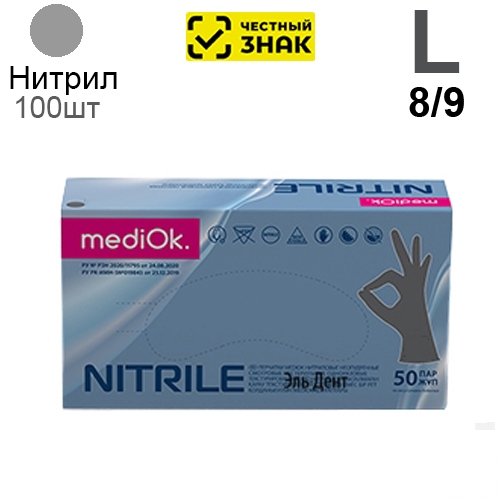 Описание: Перчатки Нитриловые "MediOk" Серые L 100 шт (50 пар). (Маркированные).
