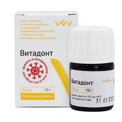 «Витадонт» - антибактериальная паста-повязка, представляет собой витаминизированный комплекс на основе воско-лецитиновой композиции, содержащий бета-каротин, витамин Е и С. Паста оказывает успокаивающее и обезболивающее действие.
